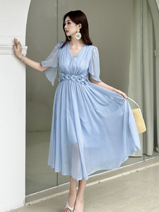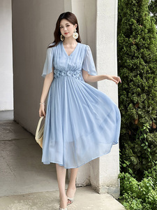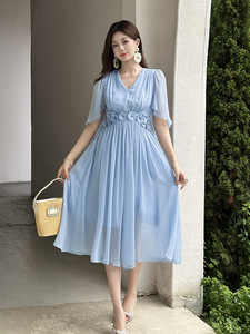 2025夏季新款女装法式V领收腰立体花朵不规则裙摆连衣裙45307