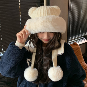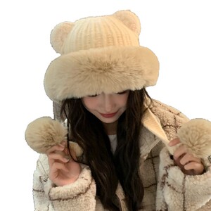 韩版冬天帽子女款可爱熊耳朵针织帽加绒加厚显脸小百搭休闲毛线帽