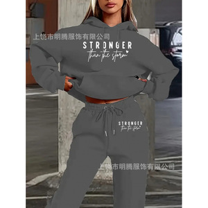 厂家直销欧美秋冬季亚马逊新款女装字母印花抓毛卫衣宽松休闲套装