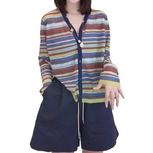 大码女装彩虹条纹V领拼接长袖针织衫女早秋新款胖MM显瘦宽松小衫