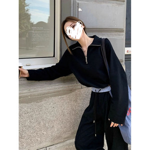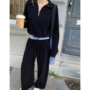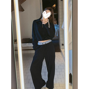 2025年早秋新款气质藏蓝色长袖翻领卫衣女休闲直筒裤长裤两件套装