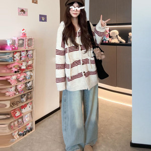 秋冬宽松休闲条纹连帽毛衣外套女中长款慵懒风松弛感针织开衫韩系