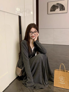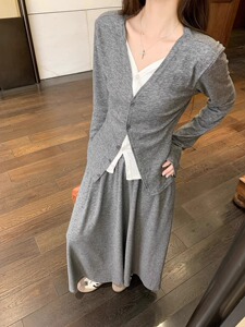 假两件撞色拼接V领长袖针织衫显瘦高腰长裙半身裙女早秋时尚套装