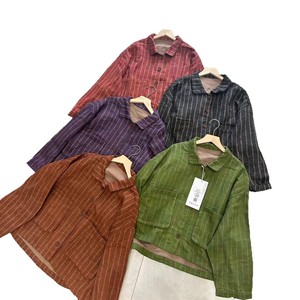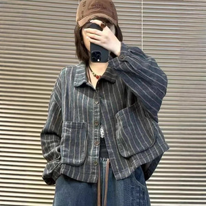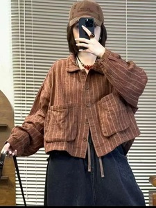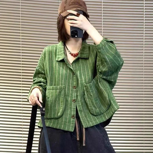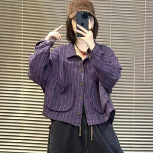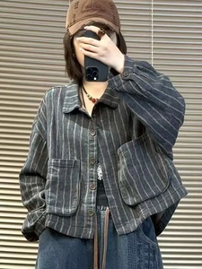 2025秋季韩版宽松复古双层麻棉大口袋条纹翻领外套百搭上衣女 839