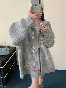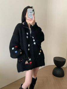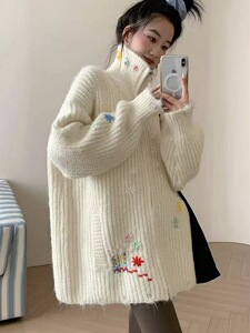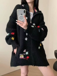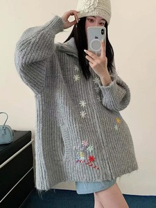 慵懒风手工花朵刺绣毛衣大外套女秋冬粗针宽松百搭针织开衫女1333