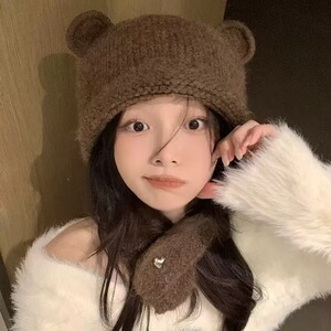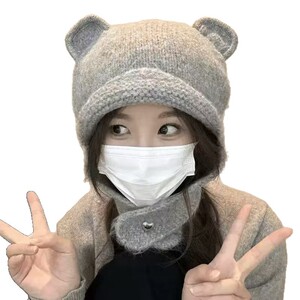 日系减龄可爱针织耳朵小熊含羊毛线帽雷锋子女护耳新款保暖帽子