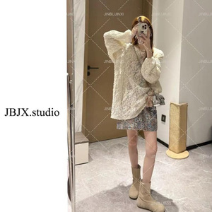 【杏仁雪松 胶花纹理针织上衣】秋冬镂空设计感宽松慵懒针织衫