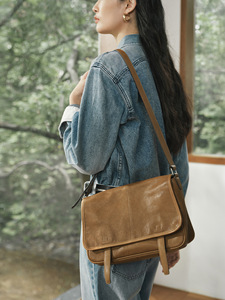 裘真植鞣牛皮信使邮差包休闲百搭复古通勤单肩斜挎腋下真皮包包女