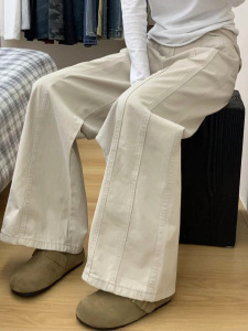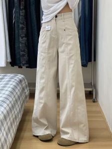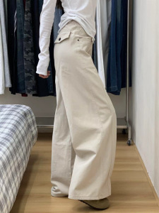 梨型身材米杏色牛仔裤女春新款大码胖高腰宽松设计感阔腿工装裤