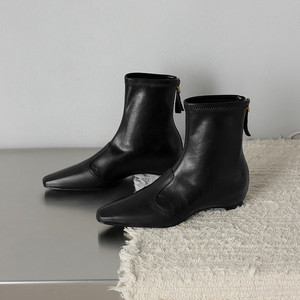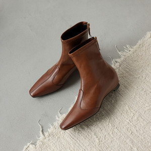 水洗牛皮秋季新款后拉链百搭复古短靴方头休闲粗跟厚底时尚瘦瘦靴