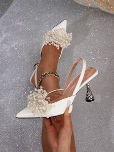 现货专供跨境时尚珍珠花朵异形方珠子细高跟尖头后空后提带凉鞋女