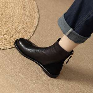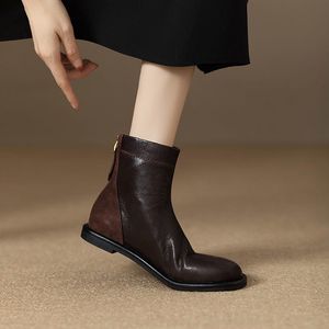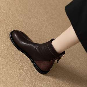 拼接设计真皮圆头复古瘦瘦靴女秋冬新款英伦风柔软通勤平底小短靴