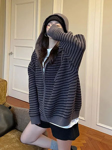 秋季新款条纹毛衣外套慵懒风宽松大版设计感连帽拉链针织开衫女
