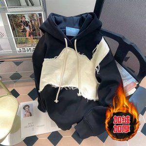 跨境韩版拼接设计感卫衣男百搭宽松连帽外套男小众懒风套头卫衣男