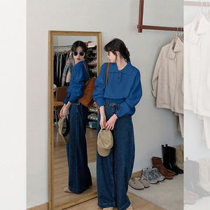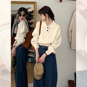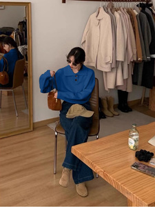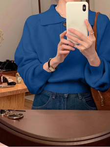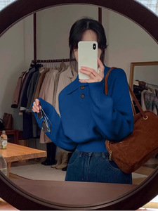 高级感蓝色翻领长袖针织打底衫女秋冬宽松短款毛衣内搭气质小上衣