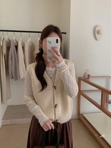 韩系复古V领牛角扣叠穿针织马甲开衫女春秋时尚通勤外搭无袖背心