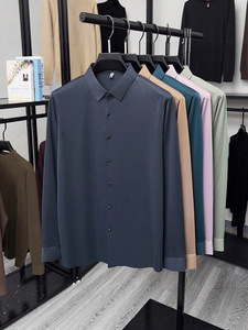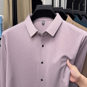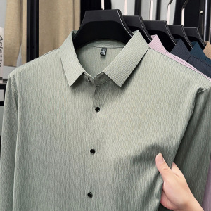 无痕印花中老年男士衬衫2025秋季新款休闲翻领透气弹力长袖衬衣男