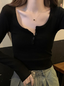 半开领辣妹修身t恤女打底衫春季秋装加绒美拉德螺纹纽扣长袖上衣