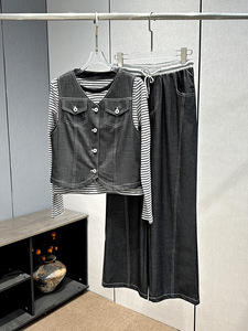深圳南油复古马甲条纹上衣松紧腰阔腿休闲长裤套装女2025秋季新款