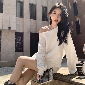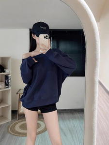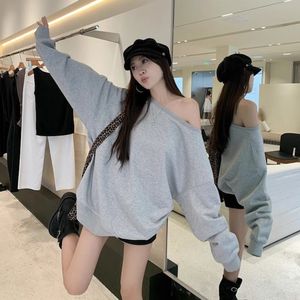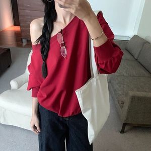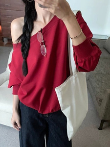 美式辣妹红色斜露肩卫衣女秋季2025新款宽松慵懒风松弛感长袖上衣