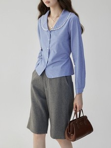 「芥末派VOOE」收腰花边彼得潘领条纹衬衫女秋季新款显瘦气质上衣