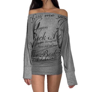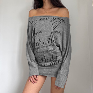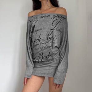 ins慵懒风不规则字母印花露背连衣裙辣妹宽松显瘦包臀一字肩短裙