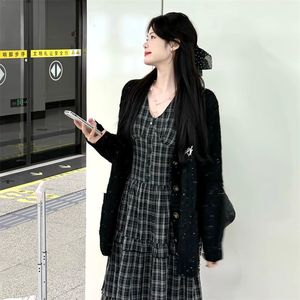 秋季套装一整套穿搭高腰显瘦格纹背心连衣裙女+黑色针织开衫毛衣