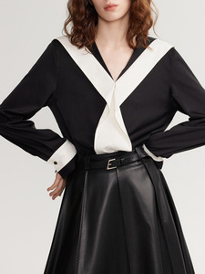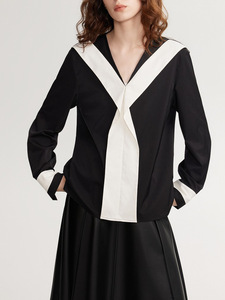 ELLE 黑白撞色减龄V领长袖衬衫女2025秋新款独特漂亮小衫