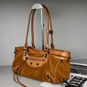 2025秋冬新款麂皮铆钉机车包老钱风手提斜挎包磨砂大容量托特包女