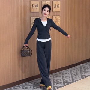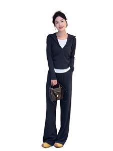 大码胖mm入秋穿搭一整套女撞色假两件连帽上衣休闲裤显瘦两件套装