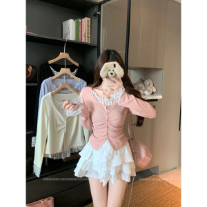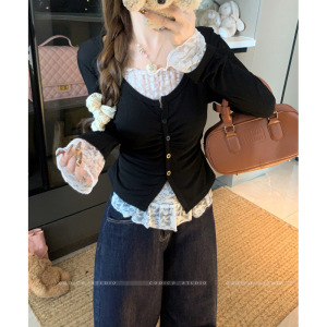 2025秋季新款胖MM显瘦遮肉蕾丝拼接上衣假两件正肩长袖T恤