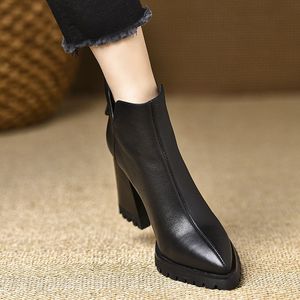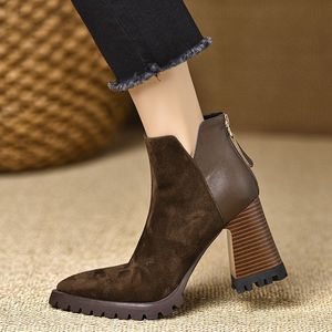 复古风防水台软皮拼接粗跟短靴女秋冬新款尖头厚底高跟百搭女靴子