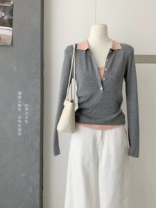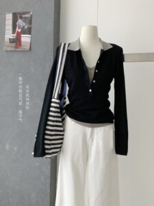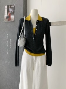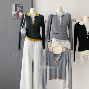 设计感撞色假两件翻领修身休闲针织衫女士秋季韩版高级感长袖上衣