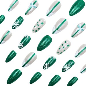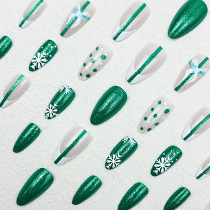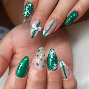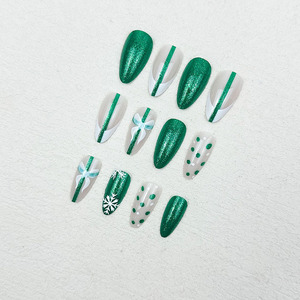 中款杏仁甲2025圣诞节绿色闪粉穿戴甲白色蝴蝶结波点雪花假指甲片