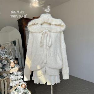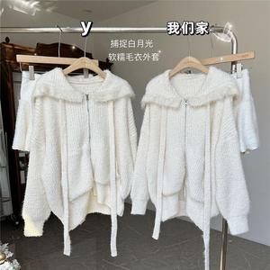 捕捉白月光秋季新款软糯连帽针织衫宽松纯欲口袋白色毛衣外套冰丝