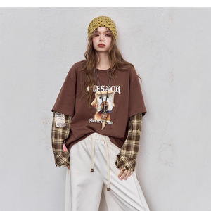 妖精的 假两件格子印花长袖t恤女2025早秋新款设计感小众上衣