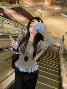秋冬休闲收腰显瘦百搭上衣女ins复古格子拼接假两件长袖圆领T恤潮