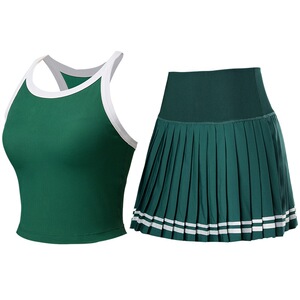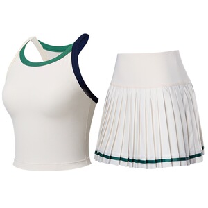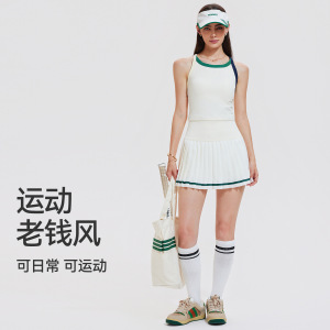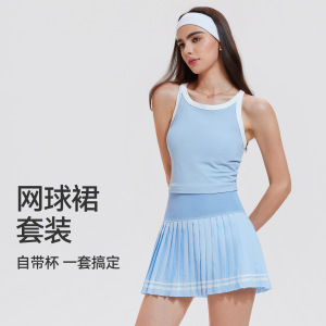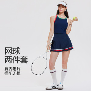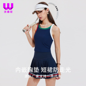 新款时尚网球服套装一体式吊带背心百褶裙撞色瑜伽健身运动服批发