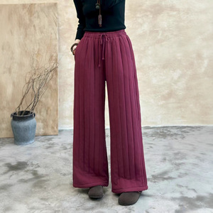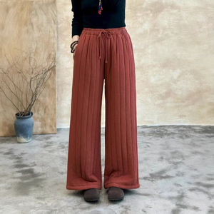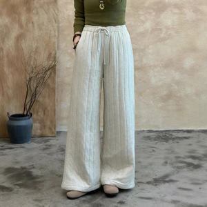 2025年秋季新款棉麻竖条女式直筒裤复古文艺宽松系带口袋休闲长裤
