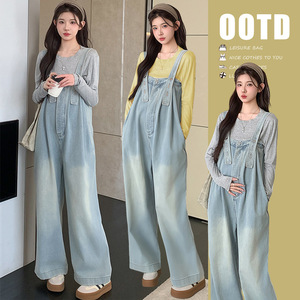 孕妇秋装套装2025新款牛仔背带裤时尚长袖春秋季宽松大码两件套女