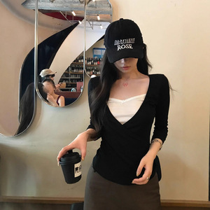复古松弛感假两件V领长袖T恤女2025新款辣妹气质减龄收腰修身上衣