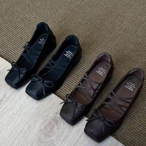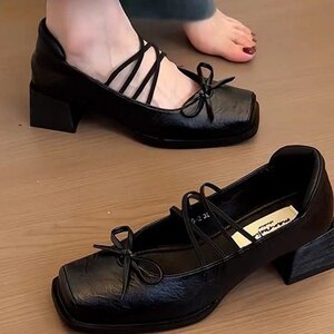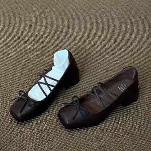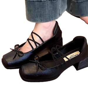法式方头芭蕾舞单鞋小皮鞋2025新款蝴蝶结浅口复古粗跟玛丽珍鞋女