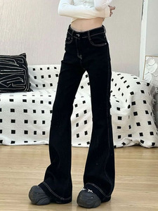 大码刺绣黑色微喇叭牛仔裤女春秋胖mm高腰显瘦弹力直筒马蹄拖地裤