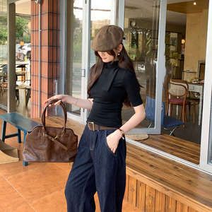莱赛尔天丝羊毛设计感半高领绑带正肩t恤女夏季新款纯色中袖上衣