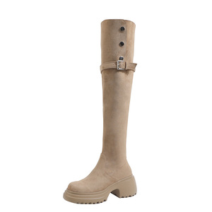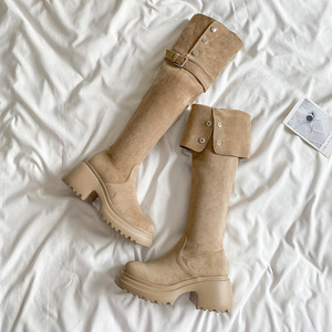 两穿翻折西部靴冬季绒面长筒靴粗跟厚底不过膝长靴骑士靴复古风