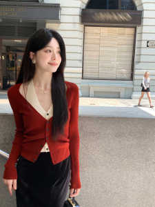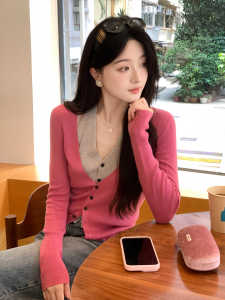 韩系粉色v领挂脖假两件针织开衫女春秋设计感毛衣拼接长袖上衣