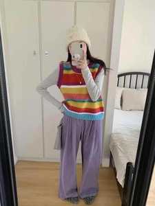 彩虹条纹V领针织马甲女2025秋冬新款宽松百搭毛衣背心撞色韩系