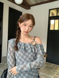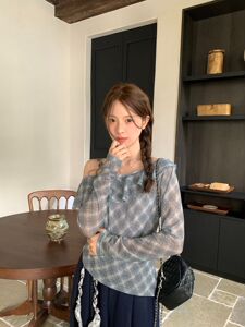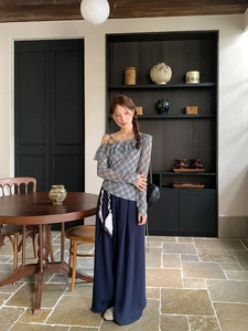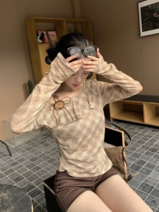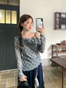 斜肩格子荷叶边长袖T恤女夏季2025新款收腰显瘦复古气质纯欲上衣