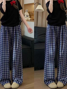 2025年秋装新款蓝色格子裤女高腰慵懒宽松遛弯裤垂感休闲阔腿裤