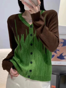 0910-171欧货设计感绿色V领长袖针织衫女2025秋季新款百搭显瘦开